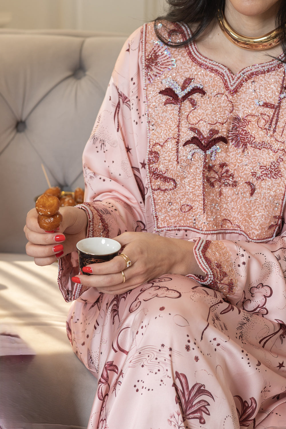 Salmon Plisse Caftan with Pearls Button